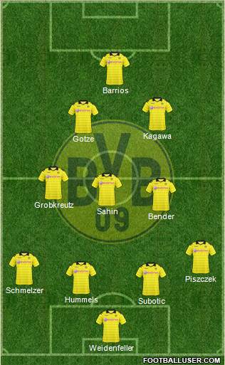 Weidenfeller · Subotic · Hummels · Schmelzer · Piszczek · Bender · Sahin · Grobkreutz · Gotze · Kagawa · Barrios