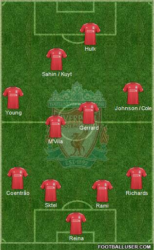Reina · Rami · Sktel · Coentrão · Richards · M'Vila · Gerrard · Young · Johnson / Cole · Sahin / Kuyt · Hulk