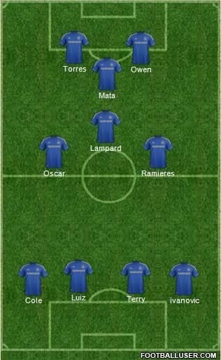 Torres · Owen · Mata · Lampard · Oscar · Ramieres · Luiz · Terry · Cole · ivanovicSUB
