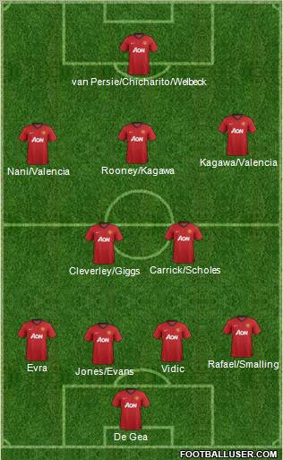 De Gea · Jones/Evans · Vidic · Evra · Rafael/Smalling · Cleverley/Giggs · Carrick/Scholes · Nani/Valencia · Rooney/Kagawa · Kagawa/Valencia · van Persie/Chicharito/Welbeck