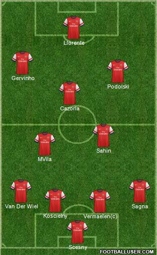 Scesny · Vermaelen(c) · Koscielny · Van Der Wiel · Sagna · MVila · Sahin · Cazorla · Podolski · Gervinho · Llorente