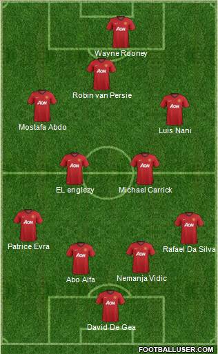 David De Gea · Abo Alfa · Nemanja Vidic · Rafael Da Silva · Patrice Evra · EL englezy · Michael Carrick · Luis Nani · Mostafa Abdo · Robin van Persie · Wayne Rooneyتشكيلة المان اليوم امام التوفيز