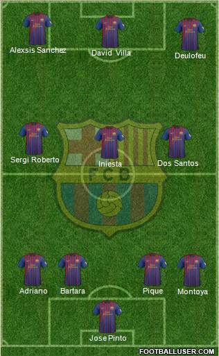 Jose Pinto · Montoya · Adriano · Bartara · Pique · Iniesta · Dos Santos · Sergi Roberto · Deulofeu · David Villa · Alexsis Sanchez
