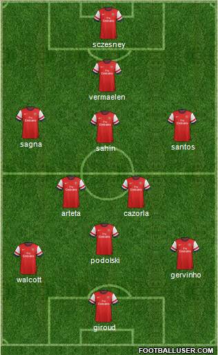 giroud · walcott · gervinho · podolski · arteta · cazorla · sahin · santos · sagna · vermaelen · sczesneyIt is a 3-4-3 because thats the closest option i have to describe it.