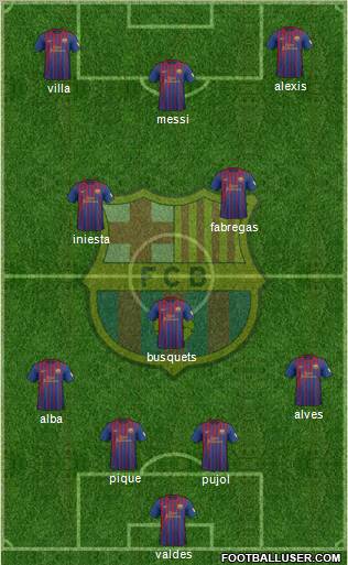 valdes · pujol · pique · alba · alves · busquets · iniesta · fabregas · messi · villa · alexis
