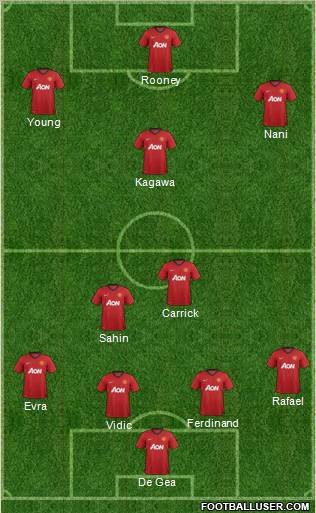 De Gea · Vidic · Ferdinand · Evra · Rafael · Sahin · Carrick · Kagawa · Nani · Young · Rooney