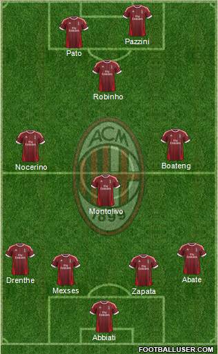 Abbiati · Zapata · Mexses · Drenthe · Abate · Montolivo · Nocerino · Boateng · Robinho · Pato · Pazzini