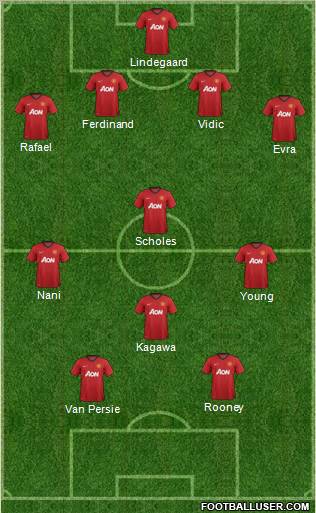 Van Persie · Rooney · Kagawa · Young · Nani · Scholes · Evra · Rafael · Ferdinand · Vidic · Lindegaard