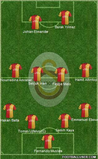 Fernando Muslera · Tomas Ujfalusi(C) · Semih Kaya · Hakan Balta · Emmanuel Eboue · Felipe Melo · Selçuk İnan · Nourredine Amrabat · Hamit Altıntop · Johan Elmander · Burak Yılmaz