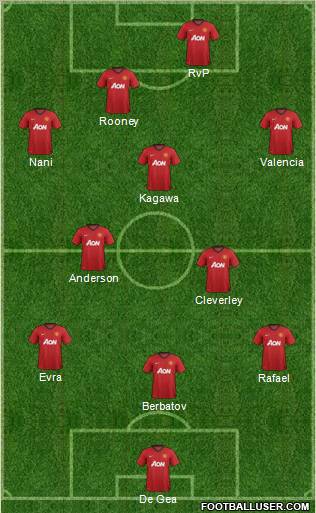De Gea · Berbatov · Rafael · Evra · Cleverley · Anderson · Kagawa · Nani · Valencia · Rooney · RvP