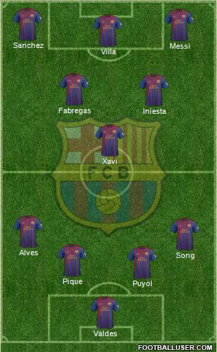 Valdes · Puyol · Pique · Song · Alves · Xavi · Iniesta · Fabregas · Villa · Messi · Sanchez