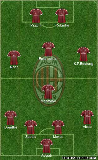 Abbiati · Zapata · Mexes · Drenthe · Abate · Montolivo · Nene · K.P.Boateng · Emanuelson · Pazzini · Robinho