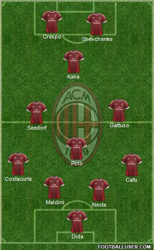 Dida · Nesta · Maldini · Cafu · Costacurta · Pirlo · Seedorf · Gattuso · Kaka · Shevchenko · Crespo