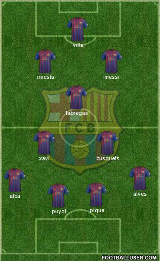puyol · pique · alba · alves · xavi · busquets · fabregas · iniesta · messi · villa