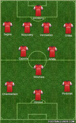 szczesny · Sagna · Koscielny · Vermaelen · Gibbs · Cazorla · Arteta · Wilshere · Podolski · Chamberlain · Giroud