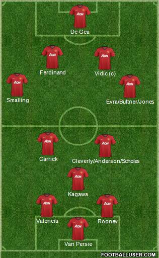 Van Persie · Rooney · Valencia · Kagawa · Cleverly/Anderson/Scholes · Carrick · Evra/Buttner/Jones · Smalling · Vidic (c) · Ferdinand · De Gea