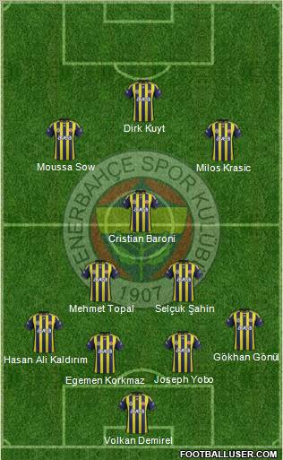 Volkan Demirel · Egemen Korkmaz · Joseph Yobo · Hasan Ali Kaldırım · Gökhan Gönül · Mehmet Topal · Selçuk Şahin · Cristian Baroni · Milos Krasic · Moussa Sow · Dirk KuytBence Fenerbahce deplasman maclarına boyle cıkmalı SPM macında savunma guzeldı sadece bıreysel hatalardan golu yedık onun dısında orta sahanın dırencıde guzeldı sadece topu ılerıye tasıcak adamlar lazım Mılos Krasıc bunu yerıne getırebılır bence bu sıstemle oynarsak cok kontra atak buluruz Hızlı Krasıc,Kuyt ve Sow da bıtırıcı Baronıde onları ataga cıkarır Baronının yerıne Alex dusunulurse Kaptan kosmadıgı ıcın Kasımpasa macındakı gıbı orta saha yanlız kalır Baronıde cok kosan bı oyuncu degıl ama hem ılerı hem gerı donmeye calısıyor.