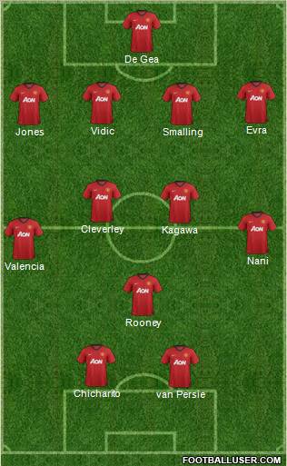 De Gea · Evra · Vidic · Jones · Smalling · Cleverley · Kagawa · Nani · Valencia · Rooney · Chicharito · van Persie