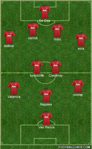 De Gea · carrick · Vidic · buttner · evra · tunnicliffe · Cleverley · rooney · Valencia · Kagawa · Van Persie