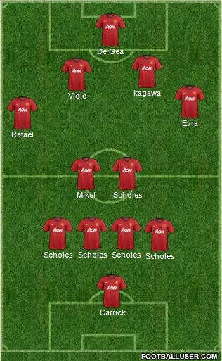 Carrick · Scholes · Scholes · Scholes · Scholes · Mikel · Scholes · Rafael · Evra · Vidic · kagawa · De Gea