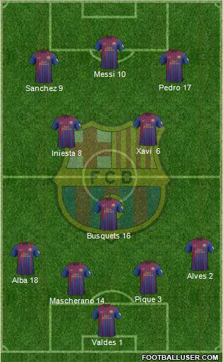 Valdes 1 · Mascherano 14 · Pique 3 · Alba 18 · Alves 2 · Busquets 16 · Iniesta 8 · Xavi 6 · Sanchez 9 · Pedro 17 · Messi 10