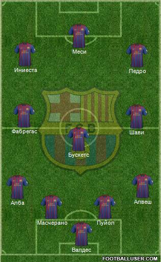 Валдес · Масчерано · Пуйол · Алба · Алвеш · Бускетс · Шави · Фабрегас · Педро · Иниеста · Меси