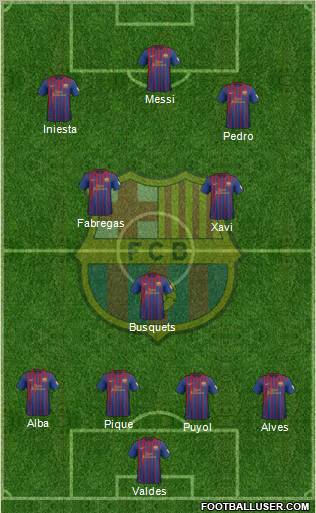 Valdes · Puyol · Alves · Pique · Alba · Busquets · Xavi · Fabregas · Pedro · Iniesta · Messi
