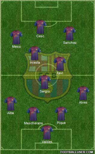 Valdes · Mascherano · Pique · Alba · Alves · Sergio · Xavi · Iniesta · Messi · Sanchez · Cesc