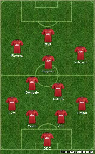 DDG · Evans · Vidic · Evra · Rafael · Carrick · Dembele · Kagawa · Valencia · Rooney · RVP