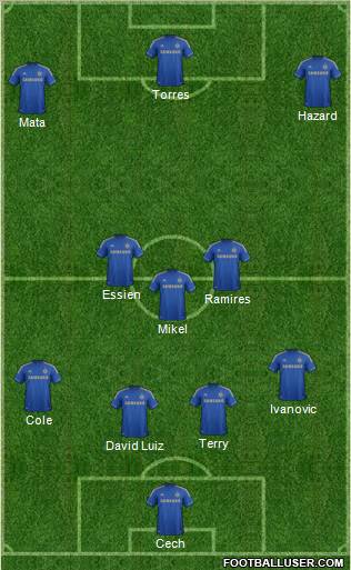 Cech · David Luiz · Terry · Cole · Ivanovic · Mikel · Ramires · Essien · Mata · Hazard · Torres