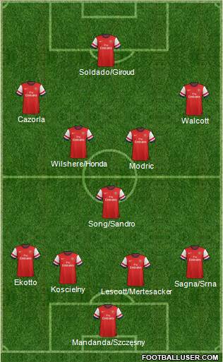 Mandanda/Szczęsny · Lescott/Mertesacker · Koscielny · Sagna/Srna · Ekotto · Song/Sandro · Modric · Wilshere/Honda · Walcott · Cazorla · Soldado/Giroud