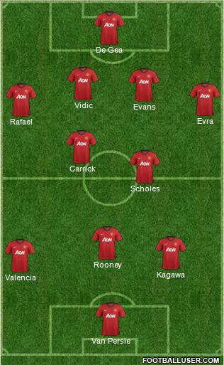 De Gea · Vidic · Evans · Evra · Rafael · Carrick · Scholes · Rooney · Kagawa · Valencia · Van Persie