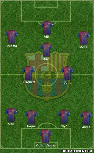 Víctor Valdés · Alves · Piqué · Puyol · Alba · Song · Busquets · Xavi · Messi · Iniesta · Villa