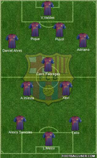 L.Messi · Tello · Alexis Sanczes · A.Iniesta · Xavi · Cecs Fabregas · Daniel Alves · Adriano · Puyol · Pique · V.Valdes