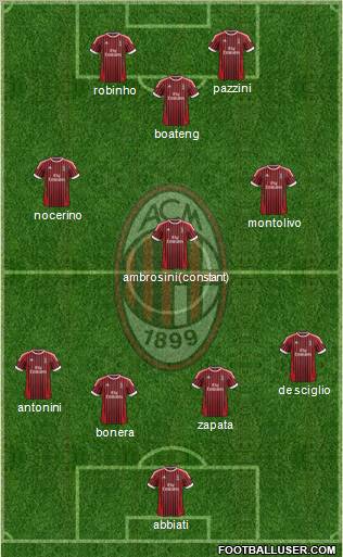 abbiati · bonera · zapata · antonini · de sciglio · ambrosini(constant) · montolivo · nocerino · boateng · robinho · pazzini