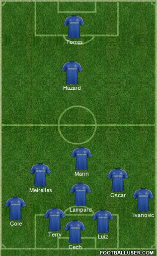Cech · Luiz · Terry · Cole · Ivanovic · Lampard · Oscar · Meirelles · Marin · Hazard · Torres