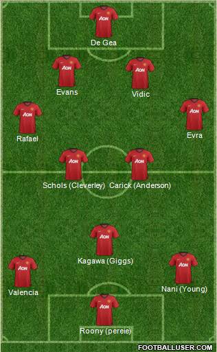 De Gea · Evans · Vidic · Evra · Rafael · Schols (Cleverley) · Carick (Anderson) · Kagawa (Giggs) · Nani (Young) · Valencia · Roony (pereie)