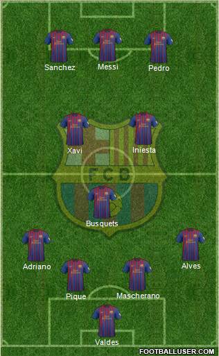Valdes · Pique · Mascherano · Adriano · Alves · Busquets · Xavi · Iniesta · Pedro · Sanchez · Messi