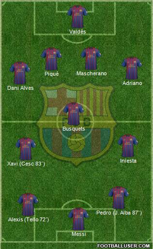 Messi · Alexis (Tello 72´) · Pedro (J. Alba 87`) · Xavi (Cesc 83´) · Iniesta · Busquets · Dani Alves · Adriano · Piqué · Mascherano · Valdés