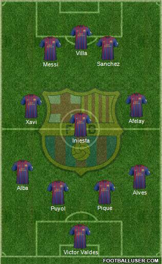 Victor Valdes · Puyol · Pique · Alves · Alba · Iniesta · Xavi · Afelay · Messi · Sanchez · Villa