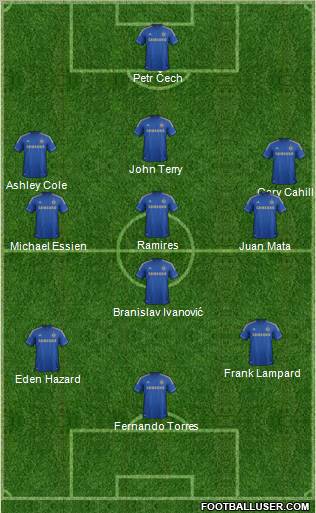 Petr Čech · John Terry · Ashley Cole · Gary Cahill · Ramires · Michael Essien · Juan Mata · Branislav Ivanović · Frank Lampard · Eden Hazard · Fernando Torres