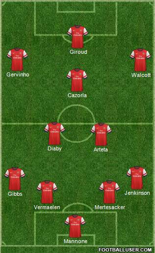 Mannone · Vermaelen · Mertesacker · Gibbs · Jenkinson · Arteta · Diaby · Cazorla · Walcott · Gervinho · Giroud