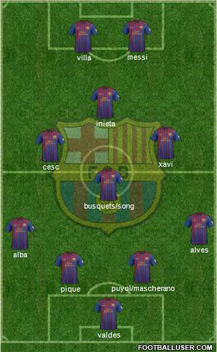 valdes · pique · puyol/mascherano · alba · alves · busquets/song · cesc · xavi · inieta · villa · messi