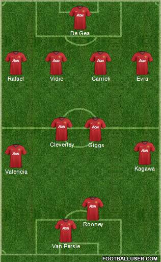 Van Persie · Rooney · Valencia · Kagawa · Giggs · Cleverley · Rafael · Vidic · Carrick · Evra · De Gea