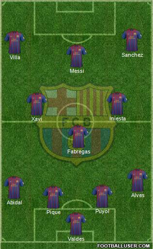 Valdes · Pique · Puyol · Abidal · Alves · Fabregas · Xavi · Iniesta · Messi · Villa · Sanchez