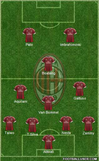 Abbiati · T.Silva · Zammy · Taiwo · Nesta · Van Bommel · Aquilani · Gattuso · Boateng · Pato · imbrahimovic
