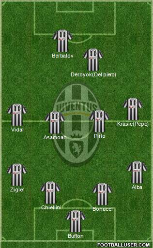 Buffon · Bonucci · Chiellini · Zigler · Alba · Asamoah · Pirlo · Vidal · Krasic(Pepe) · Derdyok(Del piero) · Berbatov