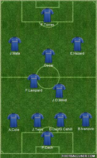 P.Cech · A.Cole · J.Terry · D.Luiz/G.Cahill · B.Ivanovic · J.O.Mikel · F.Lampard · Oscar · J.Mata · E.Hazard · F.Torres
