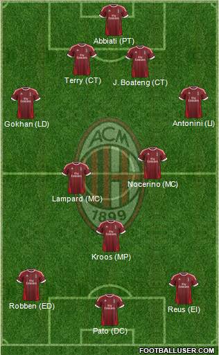 Pato (DC) · Reus (EI) · Robben (ED) · Kroos (MP) · Lampard (MC) · Nocerino (MC) · Gokhan (LD) · Antonini (LI) · J. Boateng (CT) · Terry (CT) · Abbiati (PT)