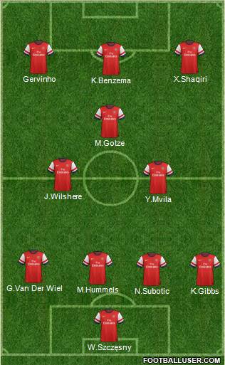 W.Szczęsny · N.Subotic · K.Gibbs · M.Hummels · G.Van Der Wiel · Y.Mvila · J.Wilshere · M.Gotze · K.Benzema · Gervinho · X.Shaqiri